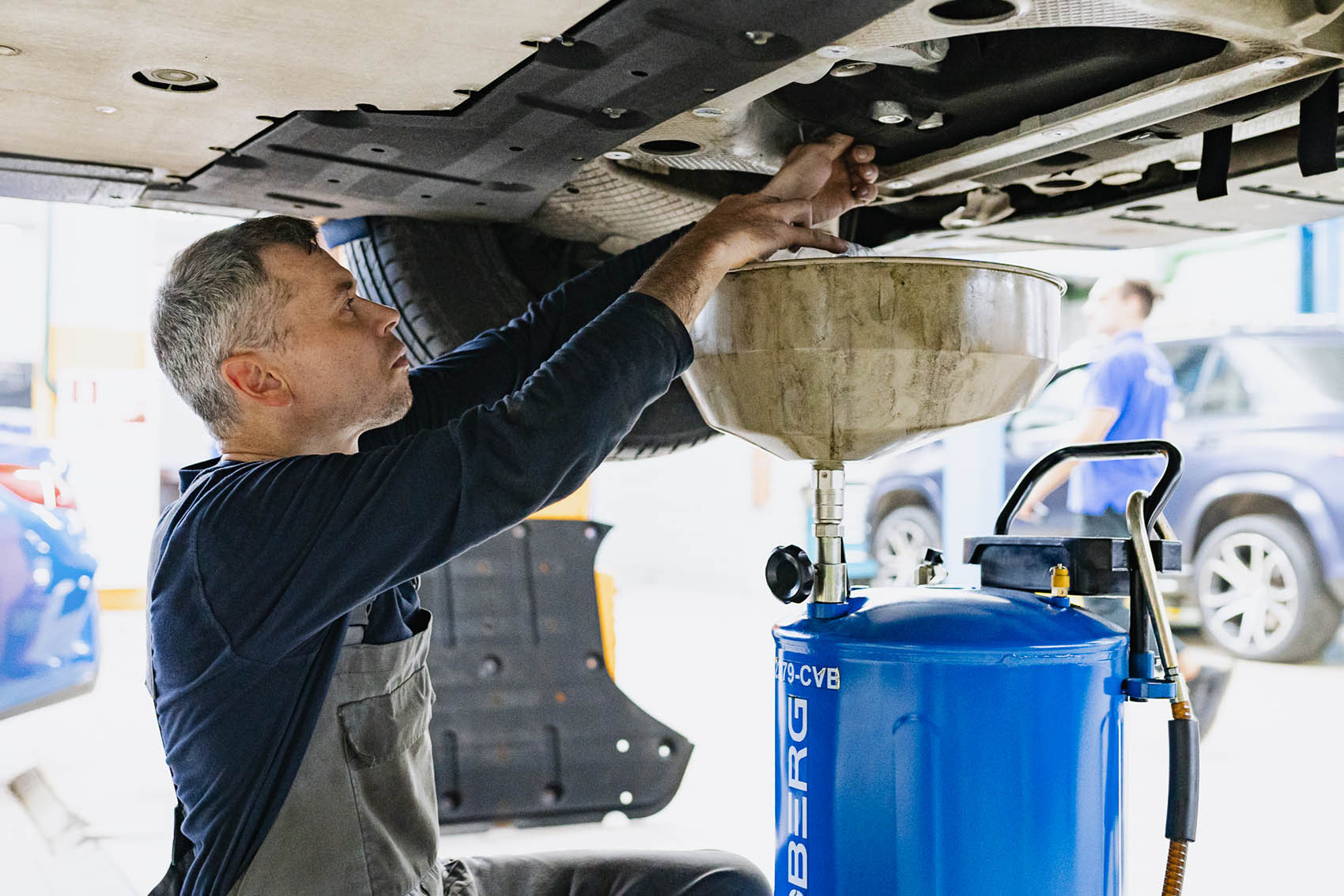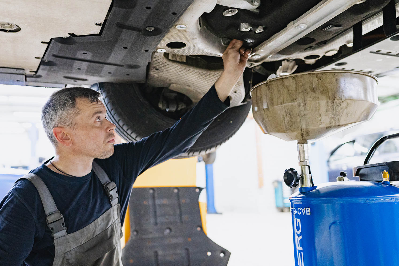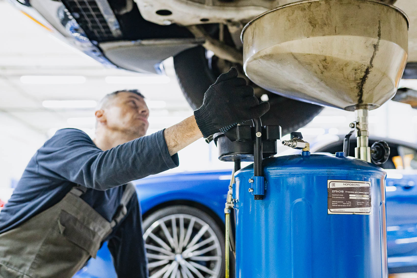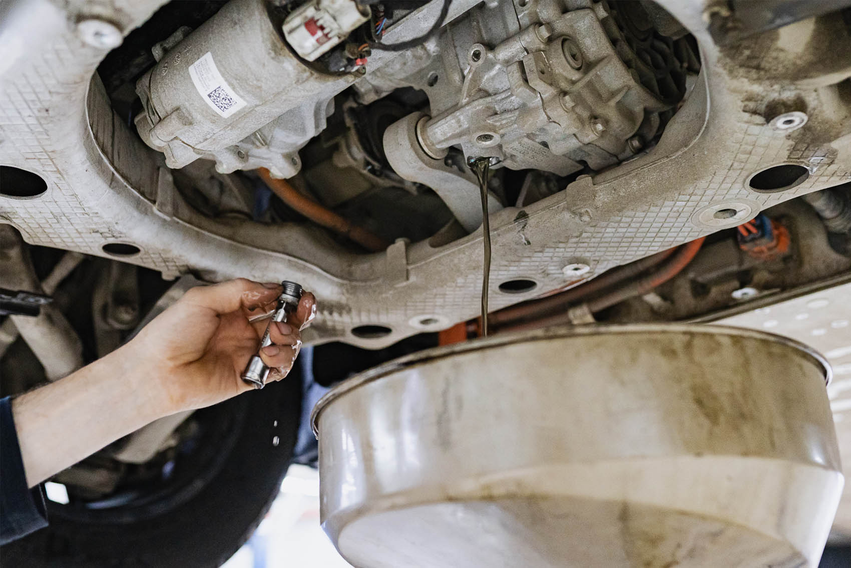 После предварительной диагностики снимаем защиту агрегатов и приступаем к замене масла в переднем электромоторе. Процедура выполняется по стандартной схеме – сначала сливаем отработанное масло, проводим осмотр агрегата и оценку состояния масла; после этого закачиваем новое масло в редуктор при помощи шприца до требуемого уровня. В соответствии с заводскими допусками мы использовали высококачественное масло от производителя ZF.