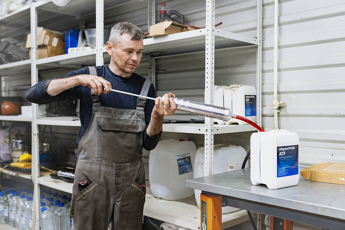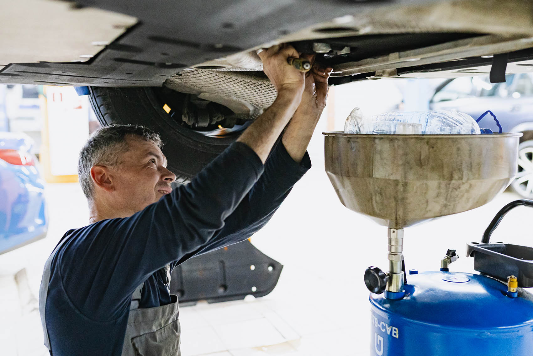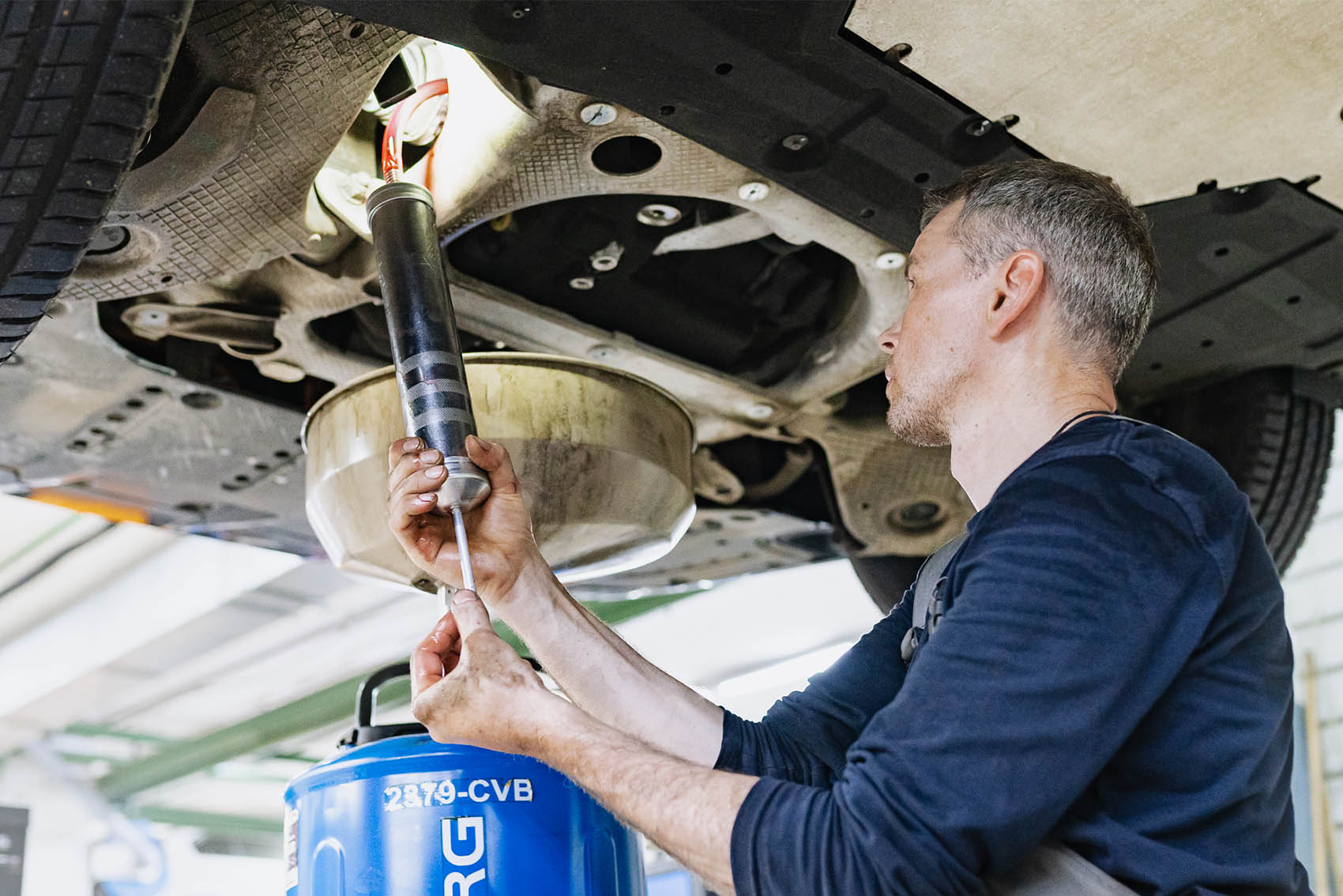 После предварительной диагностики снимаем защиту агрегатов и приступаем к замене масла в переднем электромоторе. Процедура выполняется по стандартной схеме – сначала сливаем отработанное масло, проводим осмотр агрегата и оценку состояния масла; после этого закачиваем новое масло в редуктор при помощи шприца до требуемого уровня. В соответствии с заводскими допусками мы использовали высококачественное масло от производителя ZF.