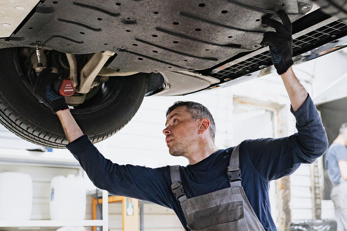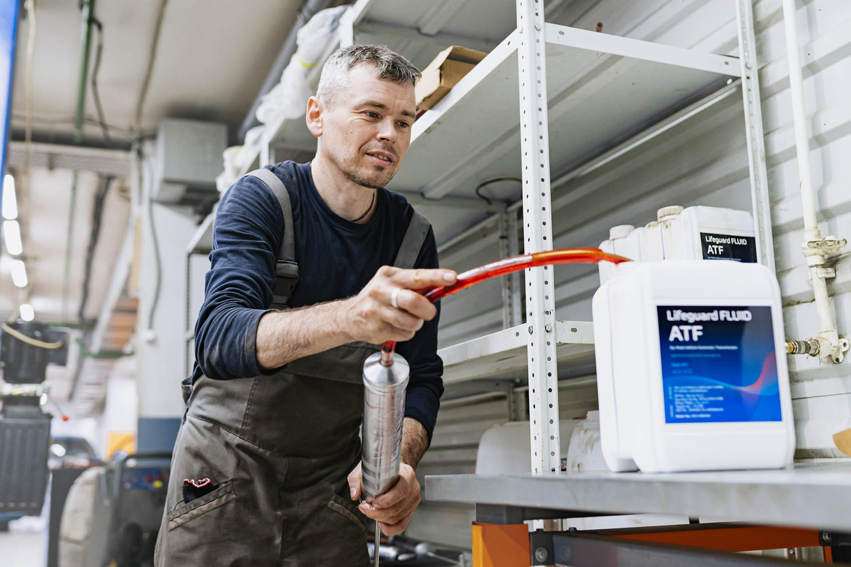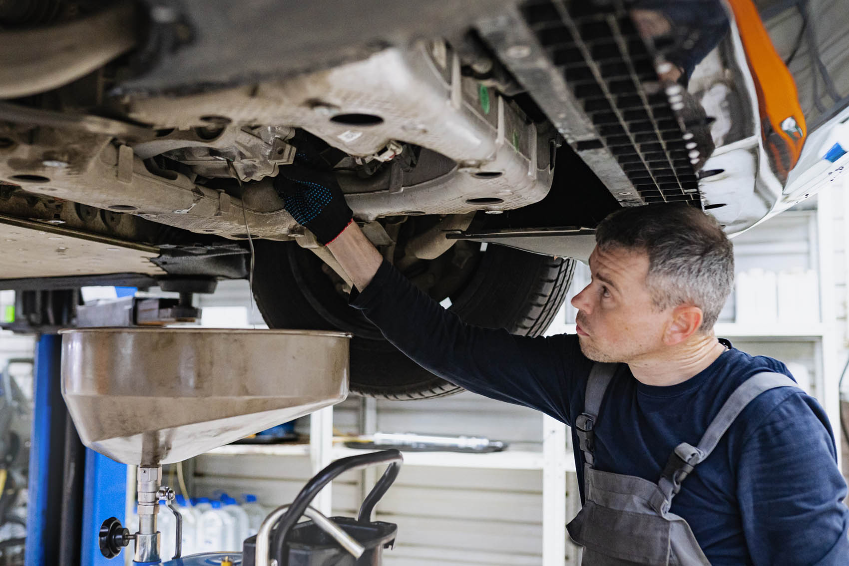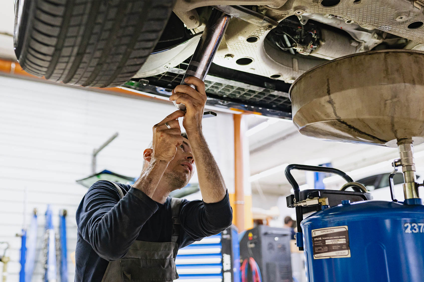 После предварительной диагностики снимаем защиту агрегатов и приступаем к замене масла в переднем электромоторе. Процедура выполняется по стандартной схеме – сначала сливаем отработанное масло, проводим осмотр агрегата и оценку состояния масла; после этого закачиваем новое масло в редуктор при помощи шприца до требуемого уровня. В соответствии с заводскими допусками мы использовали высококачественное масло от производителя ZF.