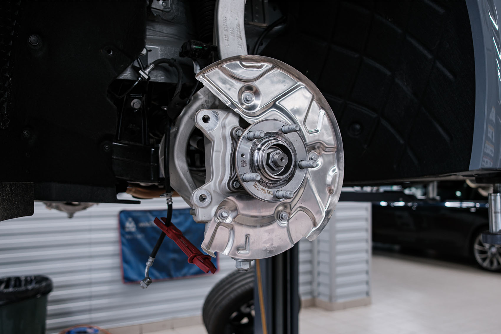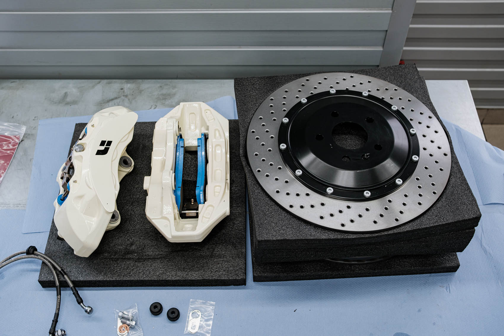 Мы начали работу с замены элементов на передней оси. В замене защитных кожухов дисков нет необходимости, поскольку новые детали подходят по размеру. Последовательно выполняем сборку новых элементов – от тормозных шлангов до суппортов. При сборке используем специнструмент и учитываем моменты затяжки.