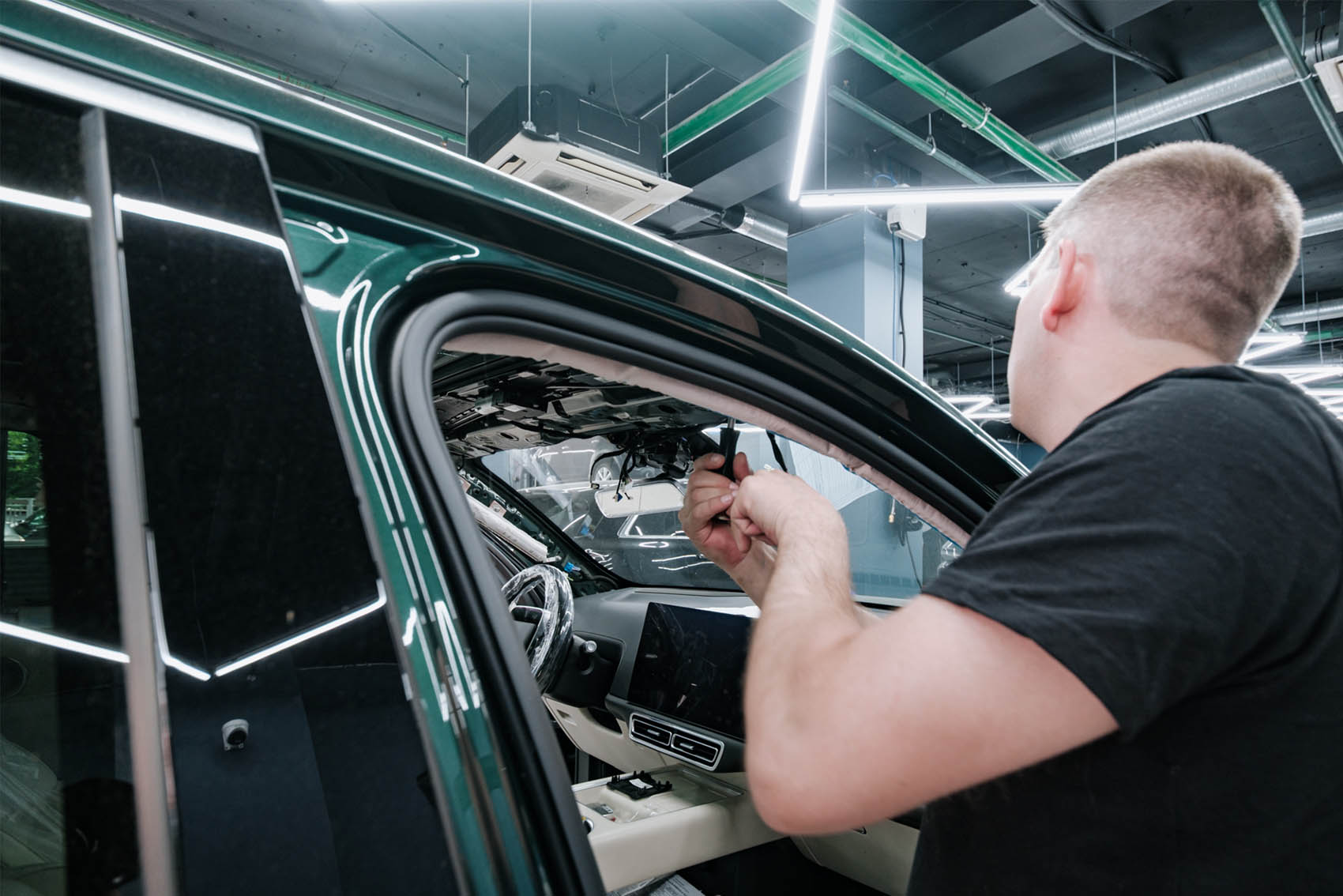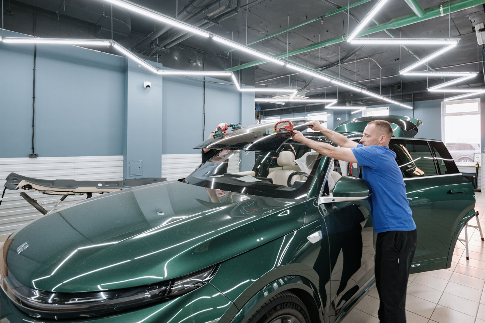 В Lixiang-STO приехал владелец популярного Lixiang L7 в красивом цвете Deep Green. На стекле передней панорамы автомобиля образовалась большая трещина, и откладывать его замену не представлялось возможным. После согласования необходимых процедур и подбора подходящего стекла наши специалисты приступили к поэтапному выполнению работы. Замена панорамы Лисян требует предельной аккуратности, поскольку необходимо снимать многочисленные элементы обшивки салона и отсоединять разъемы электроники.
