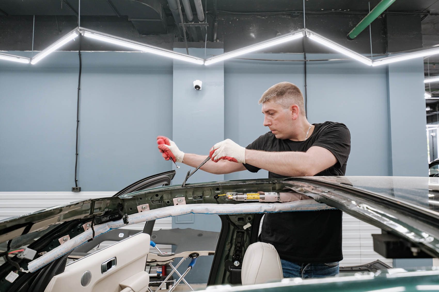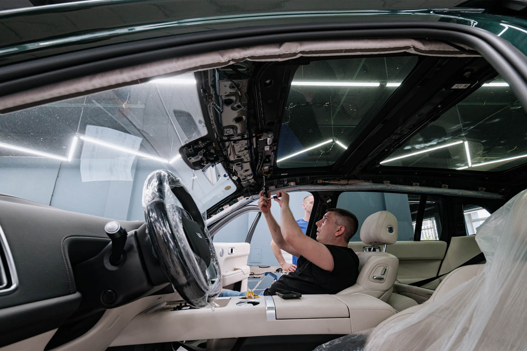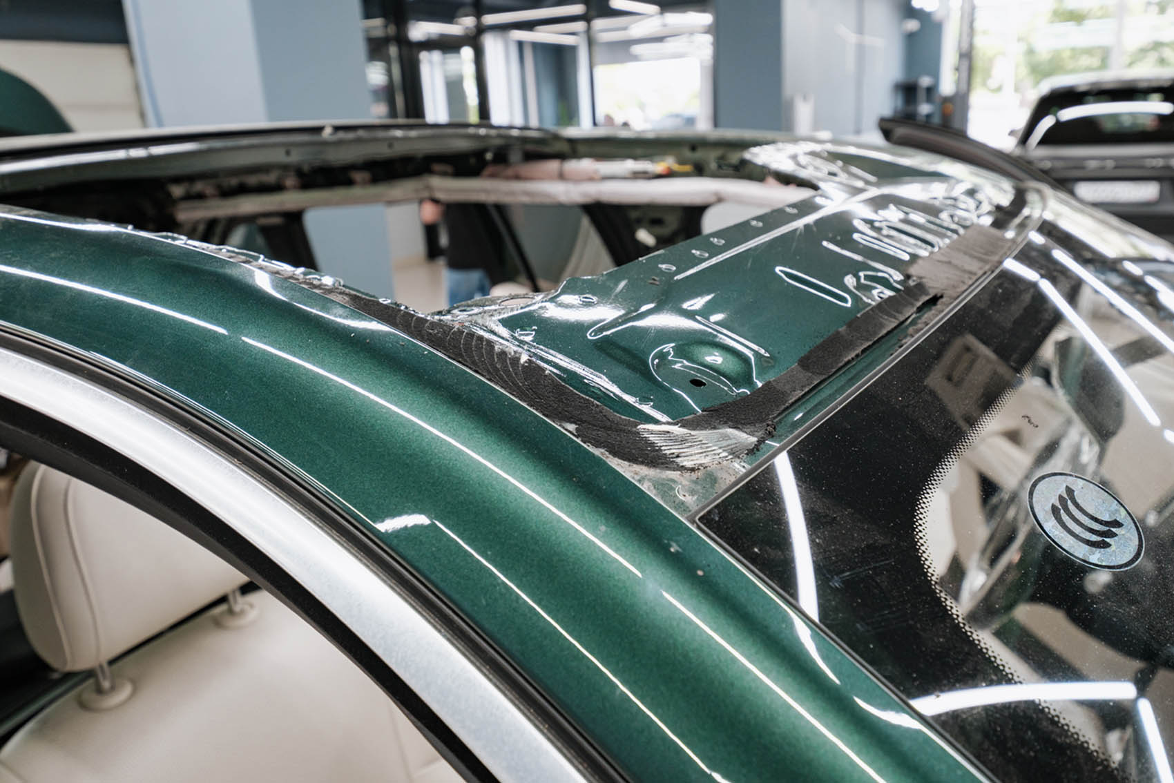 Последовательно демонтируем пластик и обшивку крыши, используя безопасные пластиковые шпатели, откручиваем крепления, затем при помощи специального ножа и струны срезаем уплотнитель, на котором держится стекло.