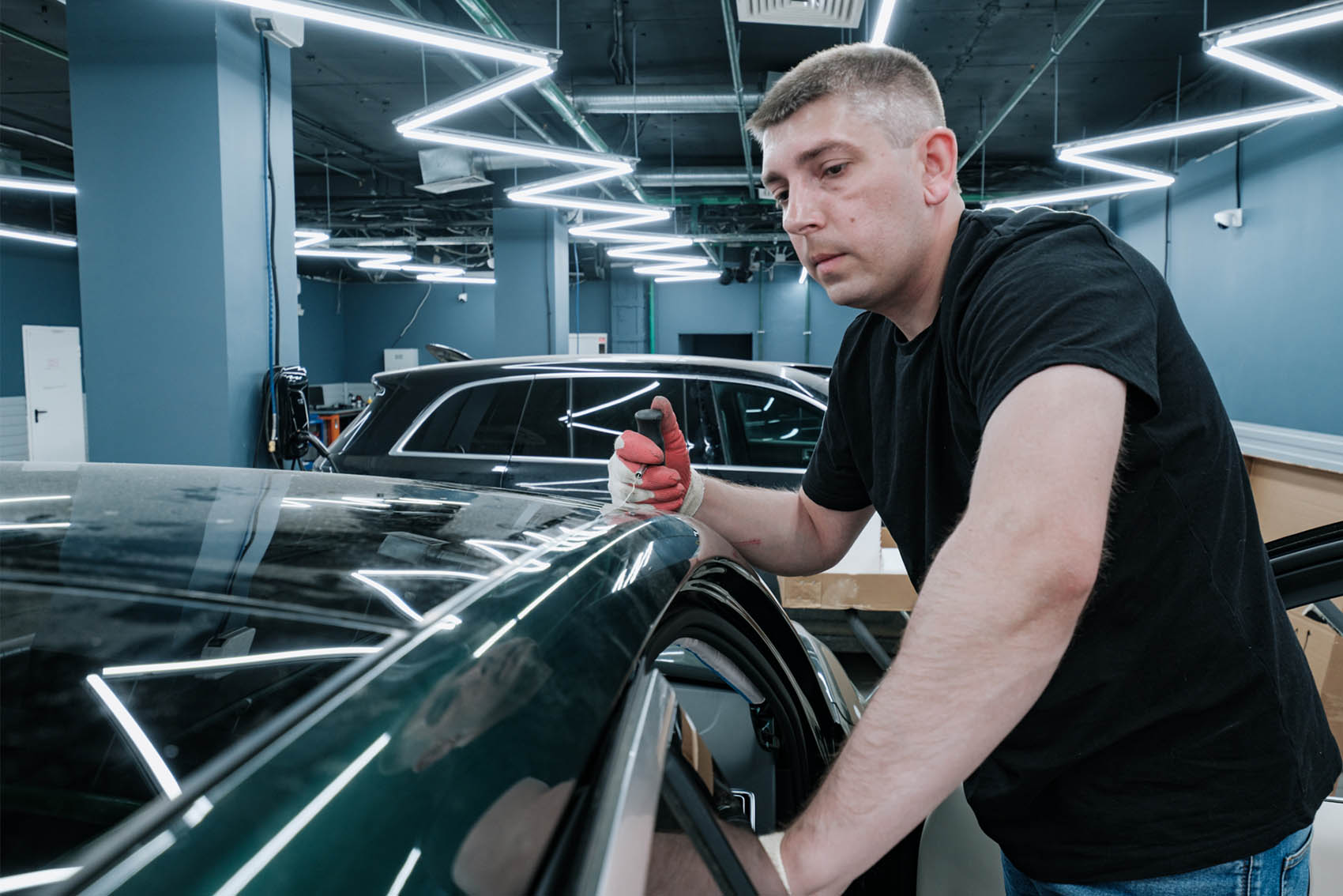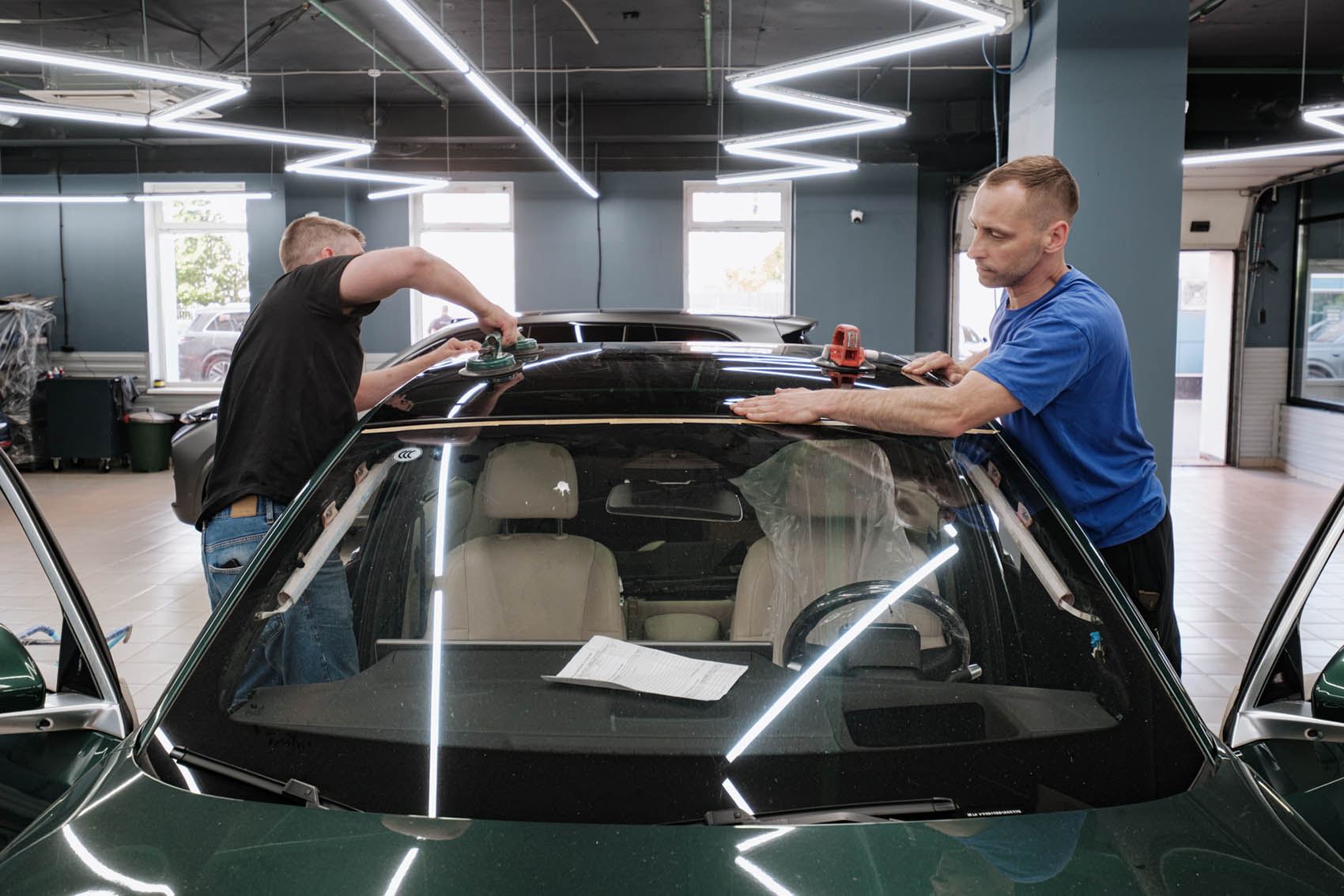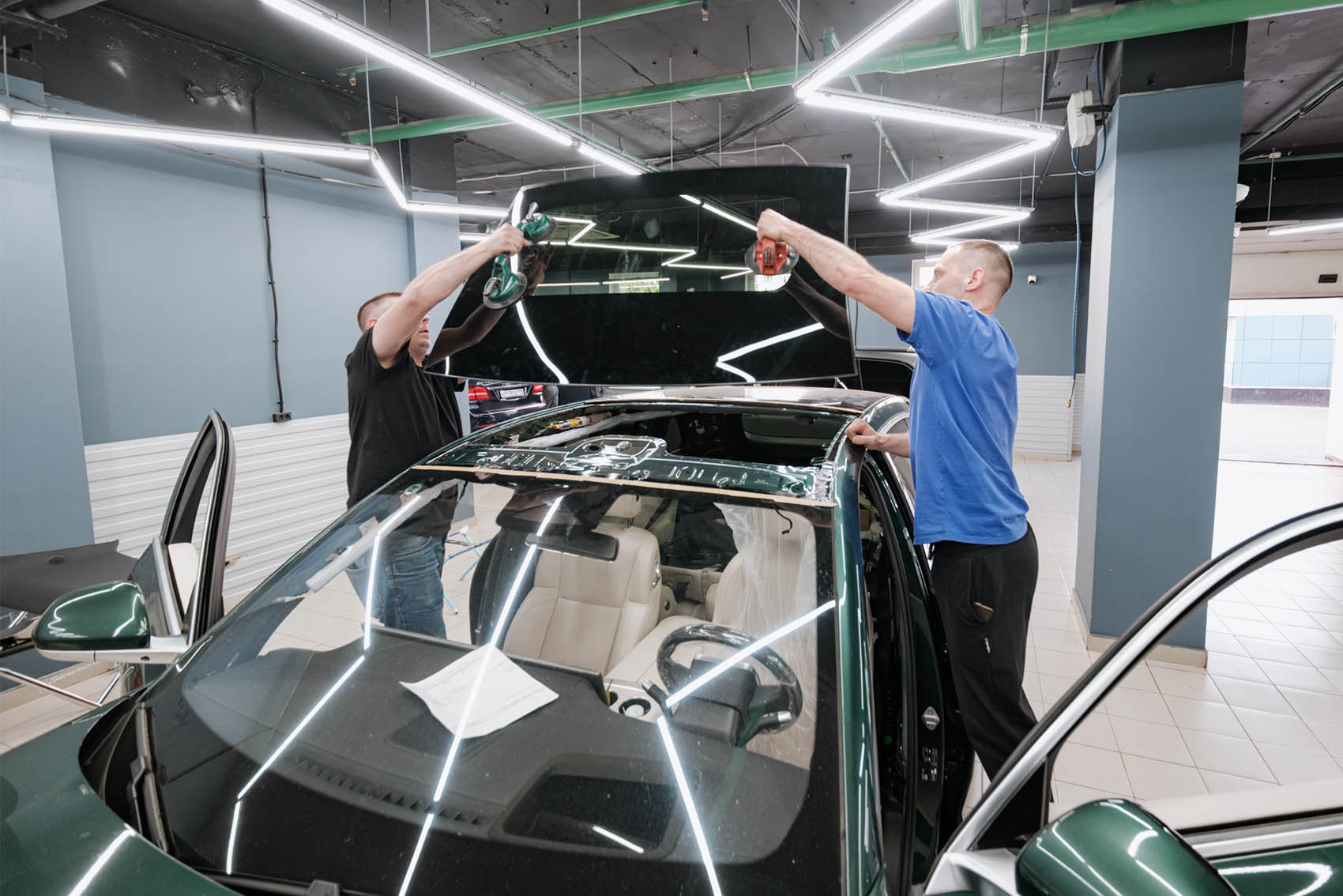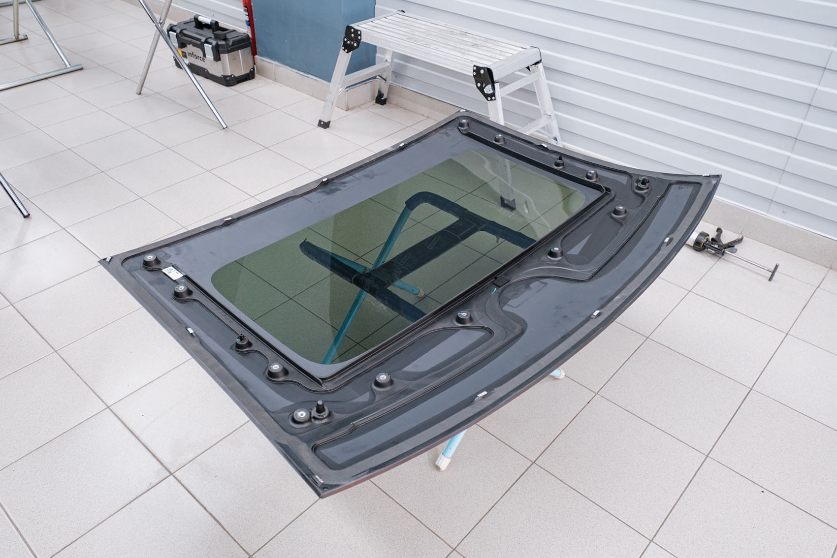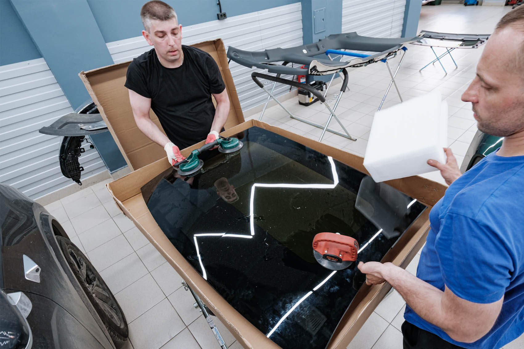 Фиксируем поврежденное стекло панорамы вакуумными захватами и вынимаем его из посадочного места. Далее осуществляем процесс подготовки поверхности для установки нового стекла: выполняем очистку привалочных поверхностей от старого герметика, обезжириваем ее и наносим новый качественный клей-герметик, соответствующий заводскому стандарту.
